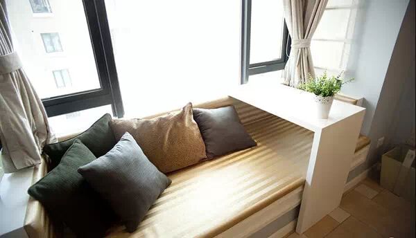 靠窗的飘窗,休闲区和功能区合二为一,加上了可移动的工作桌,让空间更加多变。